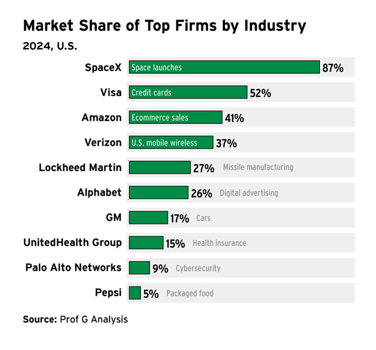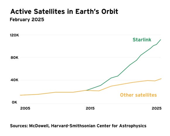 SpaceX controls nearly two-thirds of all active satellites and accounted for 87% of U.S. orbital launches in 2024 — 134 in total, up from 96 the year prior. That’s more than the rest of the world combined.