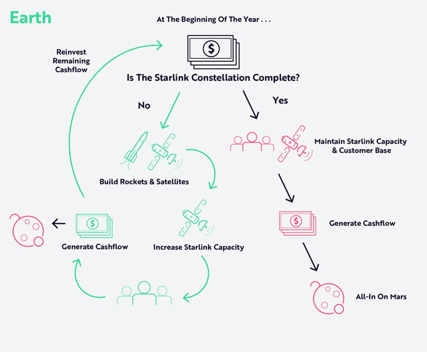 ‘Beginning with cash, SpaceX builds rockets and satellites, generates orbital bandwidth, acquires Starlink customers, and reinvests the resulting cash. As the cycle continues, funds flow gradually toward Mars development until the Starlink constellation is complete. At that point, we assume that SpaceX goes “all-in” on Mars. Each Mars-bound rocket carries a mix of Optimus humanoid robots and materials. As Optimus costs decline and productivity improves over time, SpaceX builds its Mars “book value.’