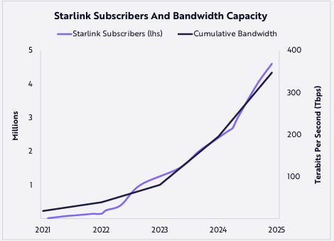 Starlink (SpaceX’s Satellite business) revenue doubled from $4 billion in 2023 to $8 billion in 2024, and is on track for $12B+ in 2025.